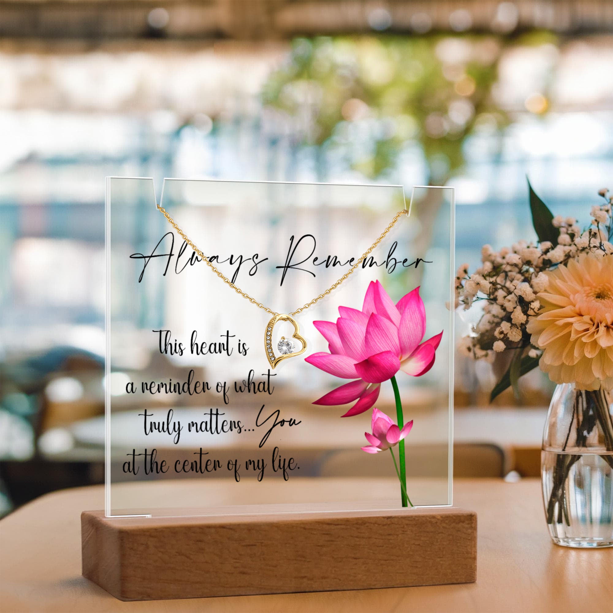 Light up someone’s world with this color-changing acrylic LED plaque, beautifully printed with a heartfelt message and paired with a stunning heart-shaped necklace — a touching symbol of love, connection, and appreciation.
