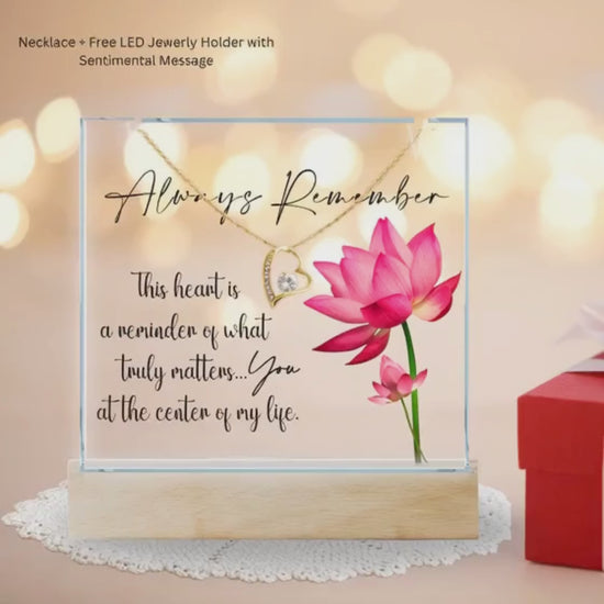 Dainty Gold Heart Necklace and LED Acrylic Jewelry Holder with Sentimental Message Gift for Loved One Jewelry Gifts for Her